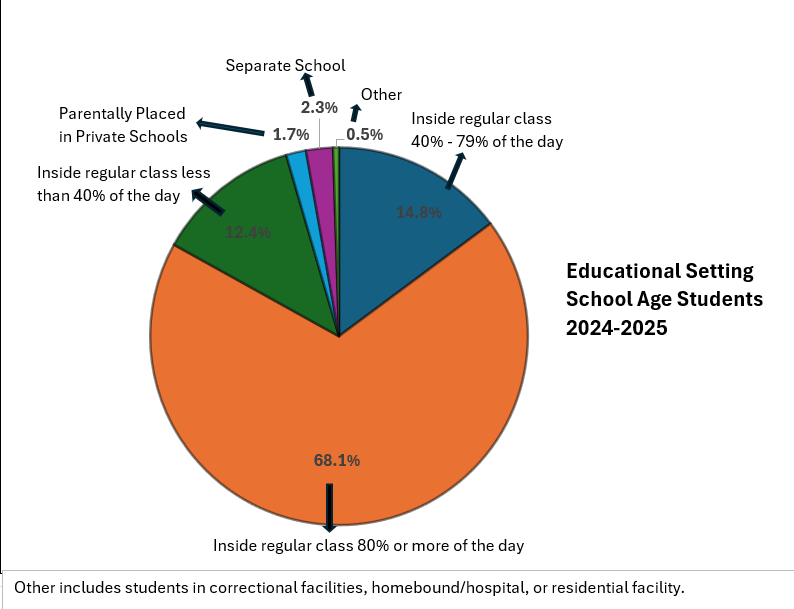 The educational settings of school age students with disabilities has changed little over the past several years. In 2020 the percentage of students educated inside regular class 80% or more of the day was 66.2% compared to 68.1% in 2024. Students inside regular class 40% – 79% in 2020 was 16.4% compared to 14.8% in 2024. These changes, while small, show that more students with disabilities are being educated in regular education than ever before which is believed to be beneficial to students.